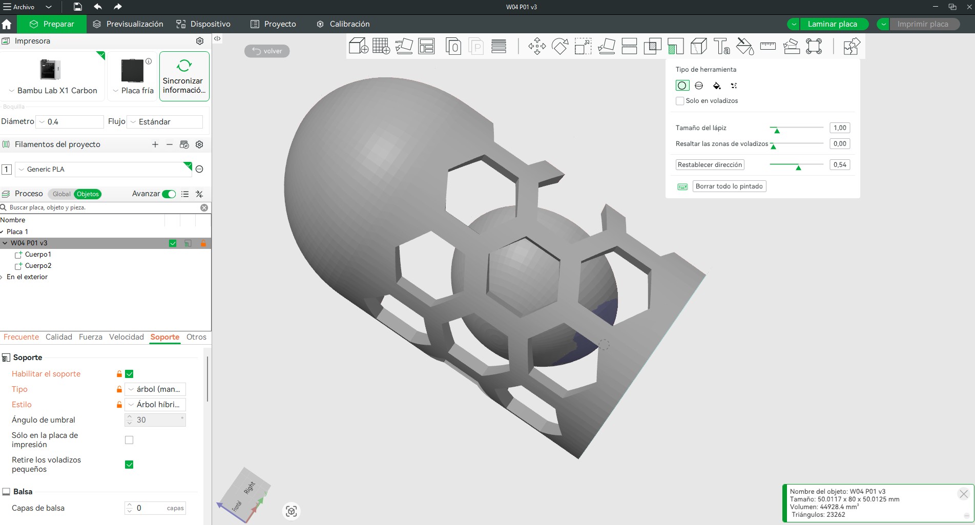 The cleaned 3D model was exported and prepared again in Bambu Studio using the Bambulab X1 Carbon printer. No supports were required due to the design orientation. A smooth surface finish was achieved using the slicer’s “smooth” tool path optimization, resulting in a detailed and faithful reproduction of the scanned geometry.