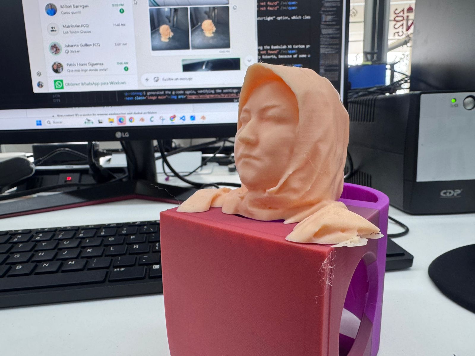 The scanning process was performed using the Creality CR-SCAN 01 structured light scanner. The object scanned was a bust of myself. The initial result was a point cloud which required post-processing in Blender to smooth surfaces, repair mesh gaps, and eliminate noise. The cleaned mesh was exported in STL format and prepared again in Bambu Studio for printing. This workflow demonstrated the full pipeline: scanning → mesh processing → slicing → printing.