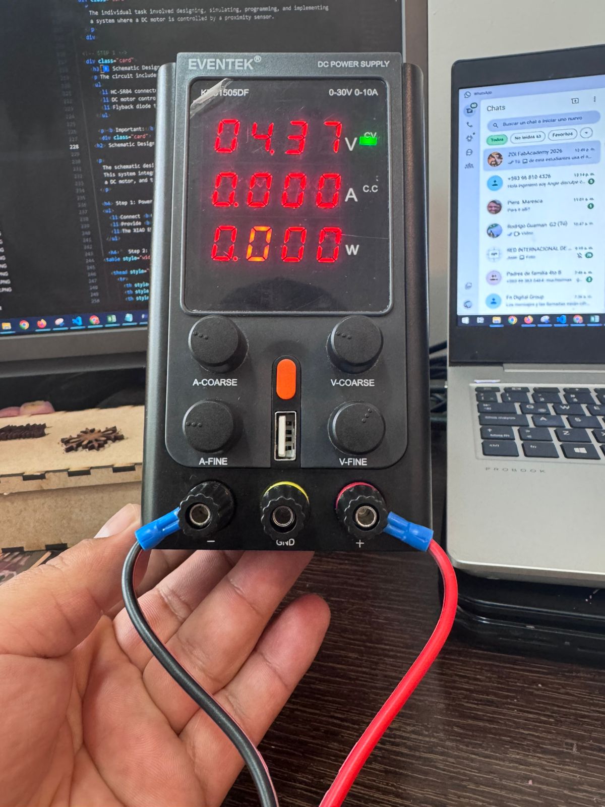 The practical work began with the assembly of the circuit on a protoboard, ensuring correct connections between the microcontroller, motor driver, and power supply. A program was developed and uploaded to the XIAO ESP32-C3 to control the motor, allowing it to rotate in both directions at fixed time intervals.
