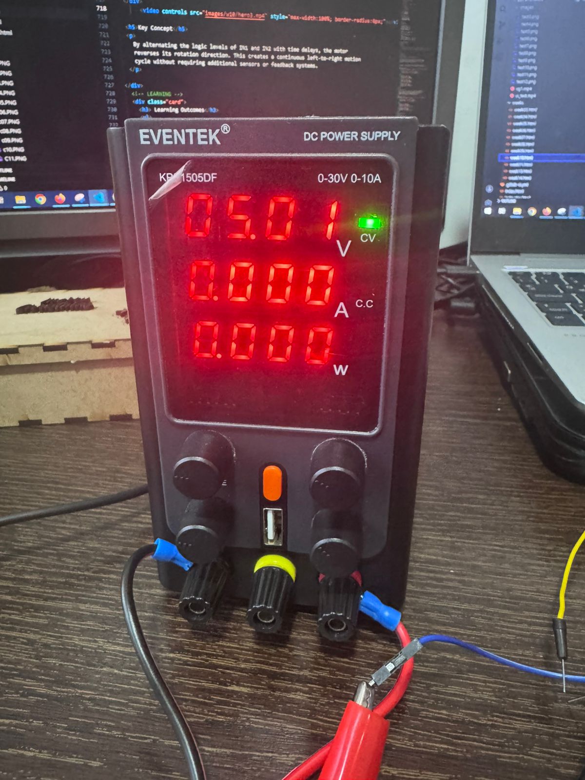The system integrates a microcontroller (XIAO ESP32-C3) with an H-bridge driver (L298N) to control the direction of a 5V DC motor. Measurement instruments such as a multimeter and a power supply are used to analyze electrical parameters, including voltage, current, and power consumption.
