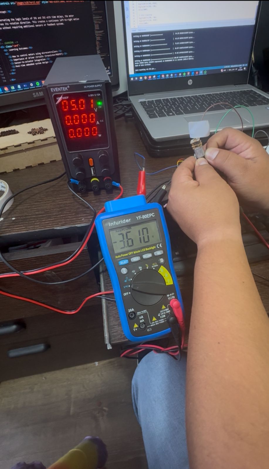 As a group, we learned how to measure electrical parameters in a real system and how to correctly use a multimeter for both voltage and current measurements. We understood the importance of measuring voltage in parallel and current in series, as well as the implications of polarity when working with bidirectional motor control.