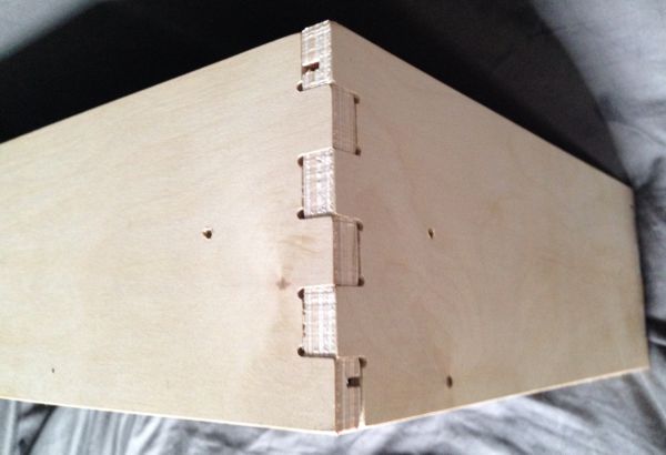 The enclosure is press fit held together only by the friction of the fingers being pushed together. It was fast and easy to design and cut. It was easy to assemble, looks pretty nice, and holds together well. The joints can be glued if a permanent joint is desired. In this case, I might need to take it apart someday.