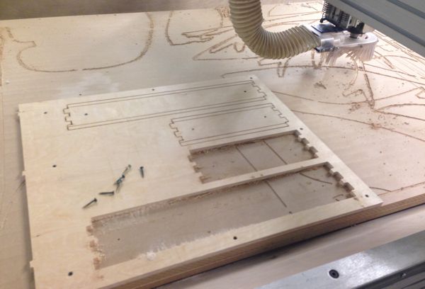 The enclosure ended up being the easiest part. I made the enclosure on the Shopbot from 1/2" thick plywood. I cut everything using only one tool, a 1/8" flat end-mill that was barely long enough to cut 1/2" deep.