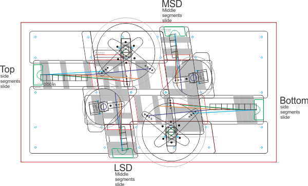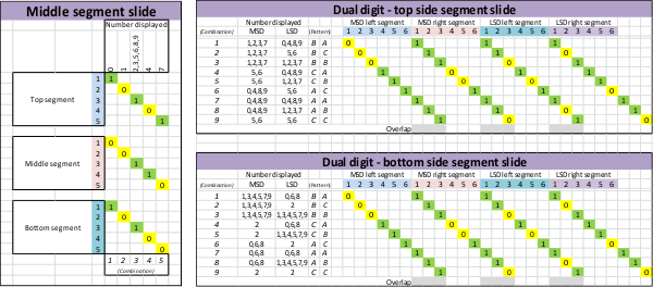 The solution was take advantage of patterns in the display combinations. For example, I was able to use the slide segment that controls the right upper segment of the most significant digit (MSD) digit to also control the left upper segment of the least significant digit (LSD) for another combination. It was challenging to design but the pattern is easy to make once it was figured out. I also tried to optimize the sequence of the patterns to reduce the movement needed from one number to the next. This is appreciated when you see how quickly the system can cycle from one digit to the next.