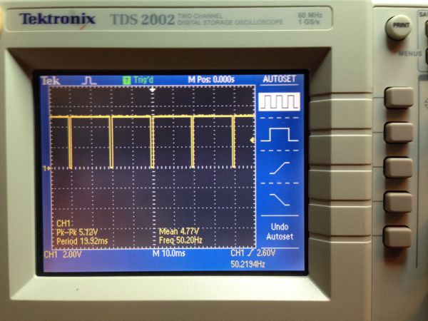 I hooked up an oscilloscope to see what the control signal really looked like. It is amazing that we can do this with a microcontroller that costs less than two dollars.