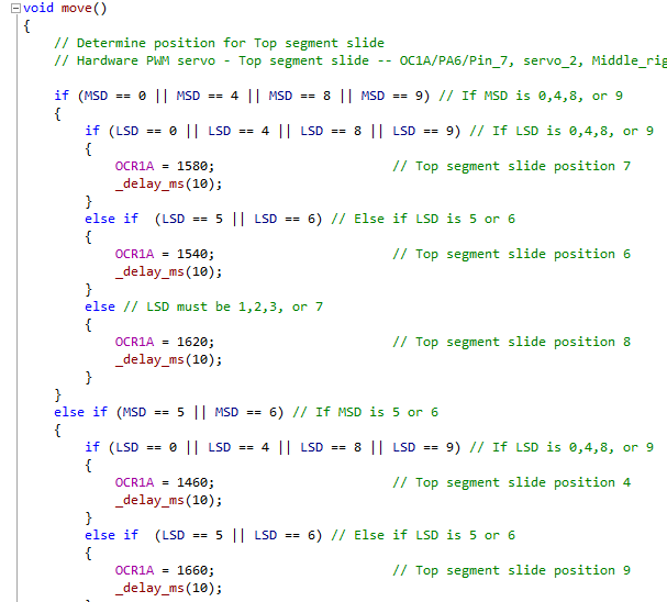I programmed the circuit board using Atmel Studio 6.2 and AVR GCC C. The program uses hardware PWM to position the two side-to-side slides and uses software PWM to position the two up-down middle segment slides.