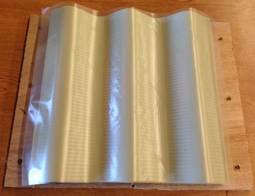 This is what the composite part looked like when it came out of the vacuum bag layers. The edges are not perfect but they could be cut and sanded. The top surface conforms to the burlap fibers.