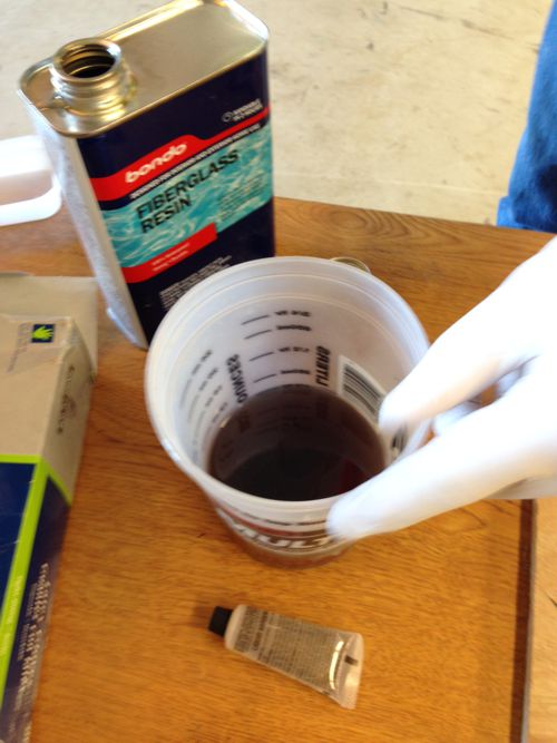 I mixed 8 oz. of fiberglass resin with 80 drops of hardener and mixed thoroughly trying not to create air bubbles.